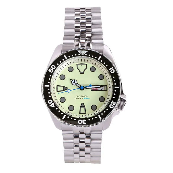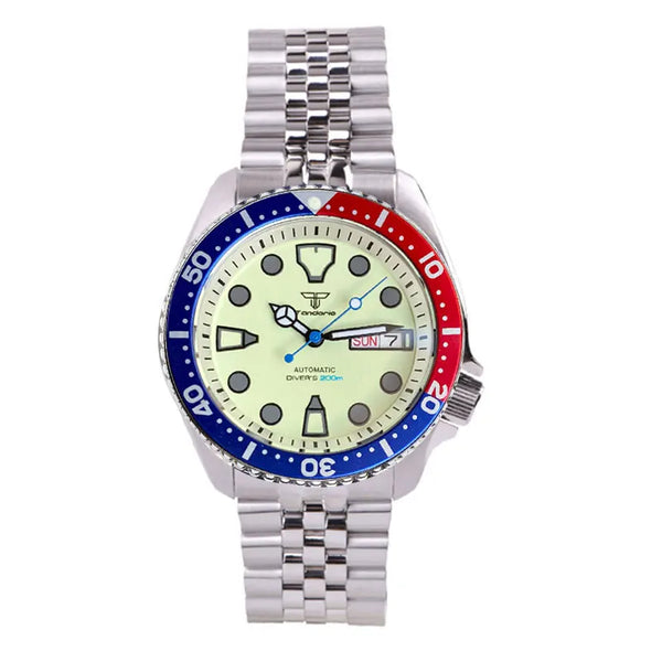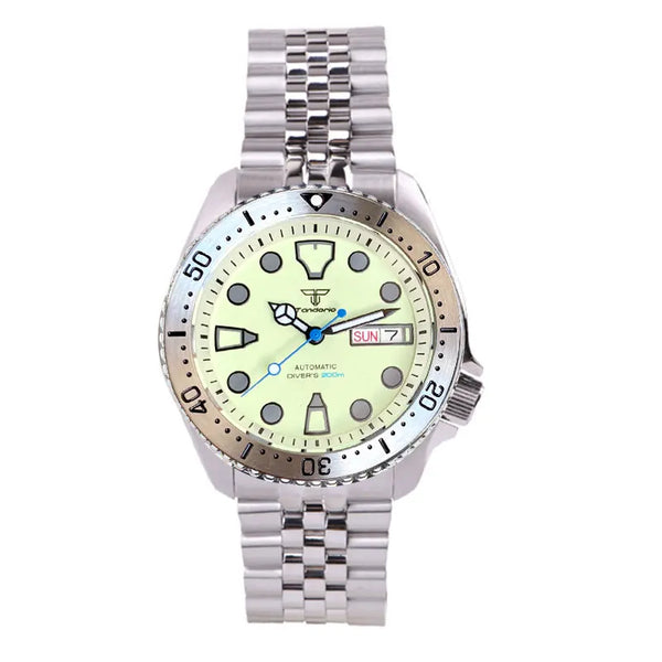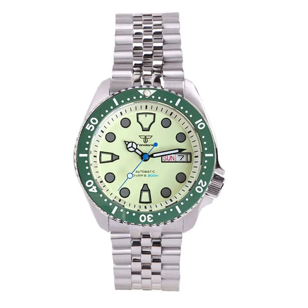 The Tandorio SKX Diver TD255 watch boasts a sapphire crystal and is waterproof up to 200m. The green luminous dial utilizes NH36A automatic movement for accurate timekeeping. Perfect for diving with its rotating bezel, this watch is a must-have for men looking for reliability and durability.