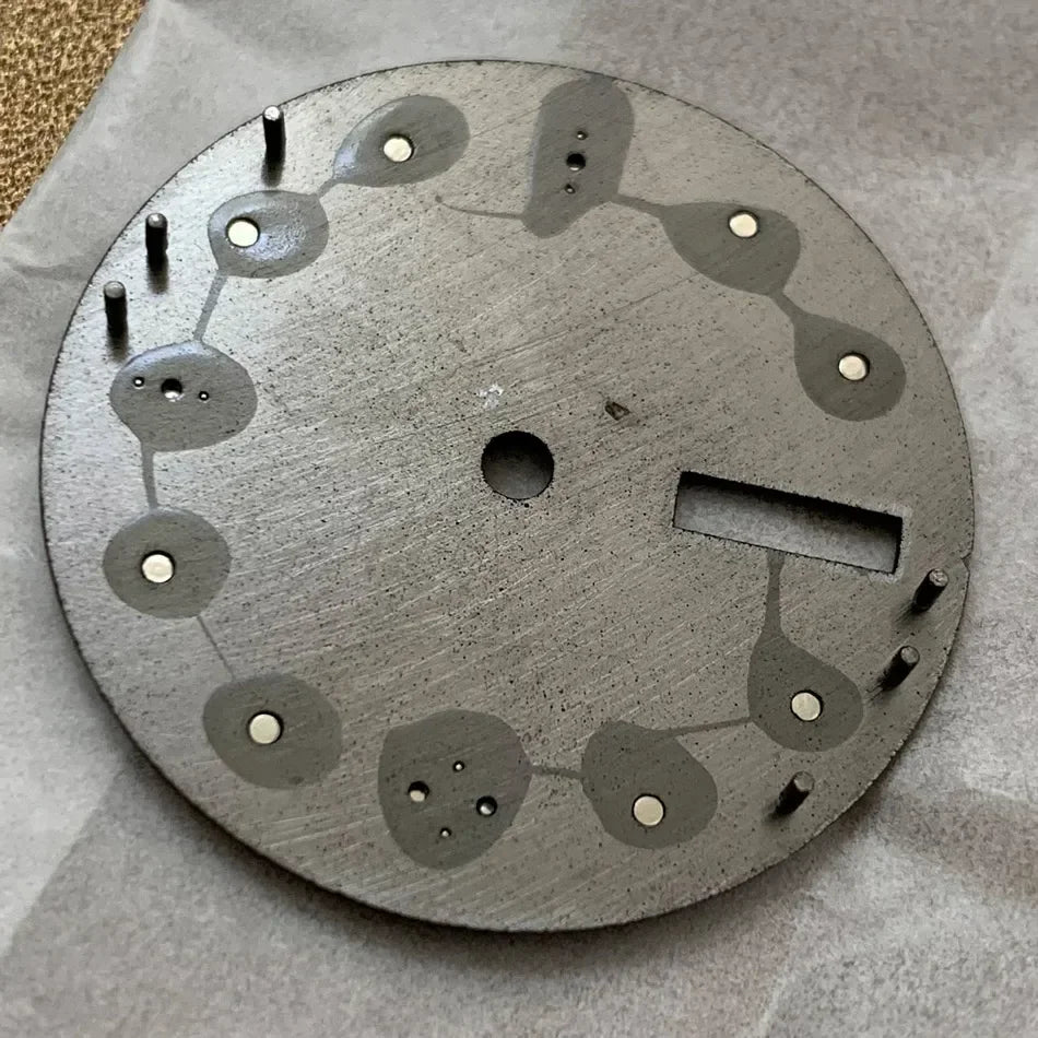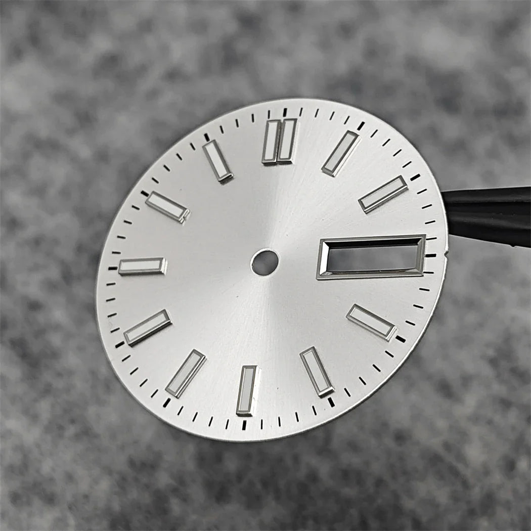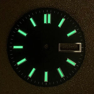 This 28.5mm double calendar watch dial is designed with a sunburst pattern and features green luminous accents. It is compatible with the NH36, 4R, and 7S movements, making it a versatile addition to your watch modification accessories. Get a unique and functional dial that will elevate your timepiece.