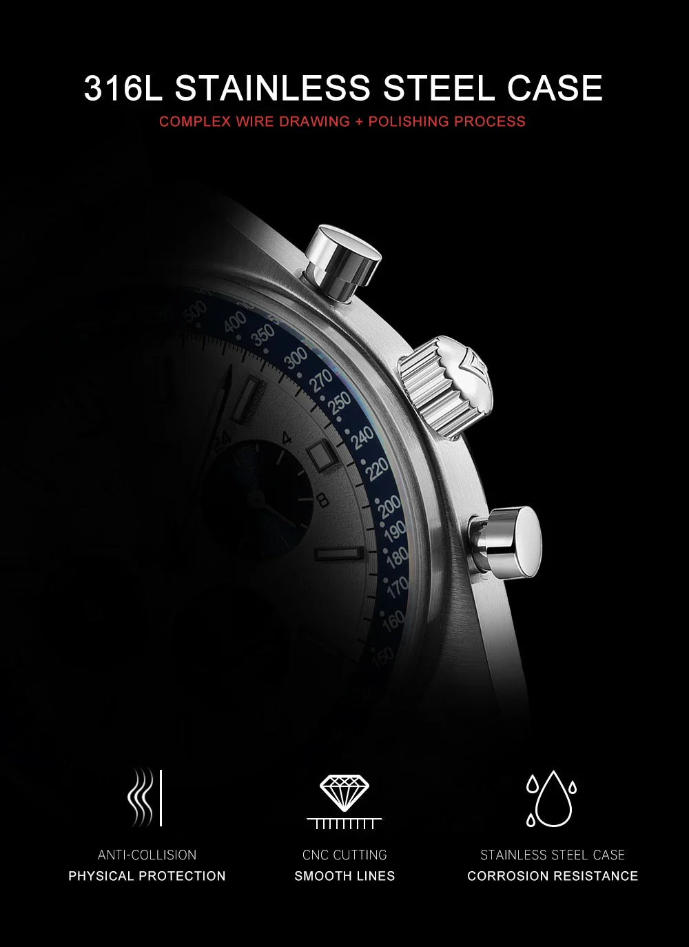 - Features: Luminous Hands, Chronograph, Water Resistance