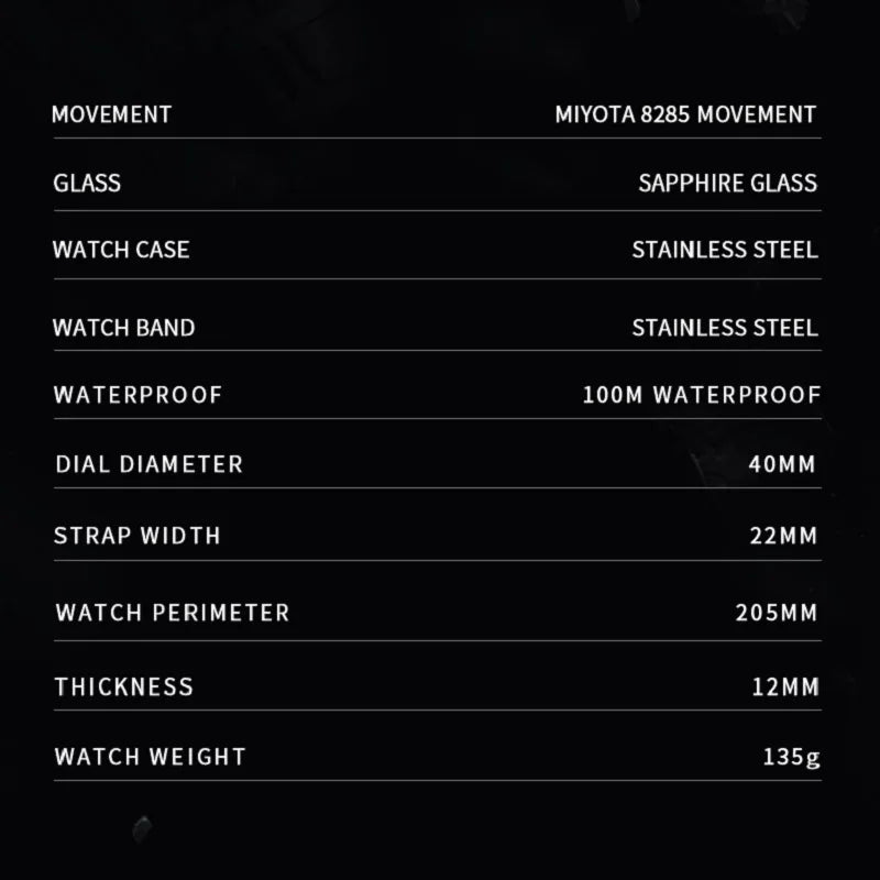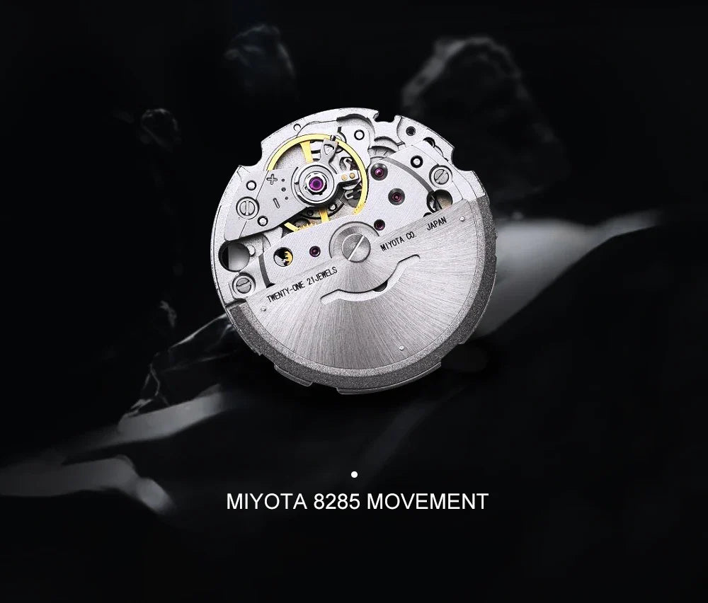 ✔ MIYOTA 8285 Automatic Movement – A high-precision automatic self-winding and hand-wind mechanical movement for reliable and accurate timekeeping.