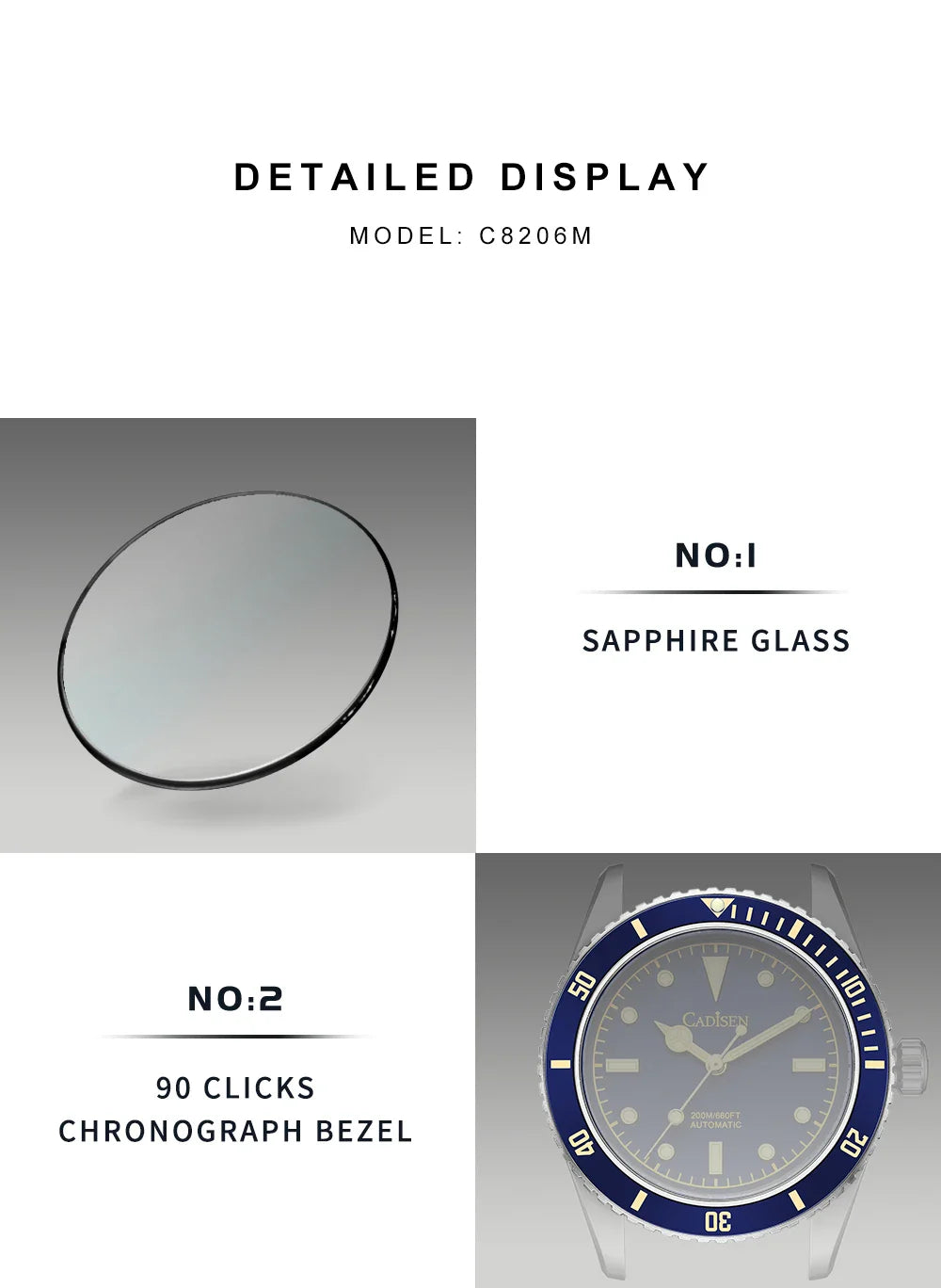 Experience luxury and precision with the CADISEN C8206 Men Watch. This vintage-style timepiece boasts a 38mm diver design, automatic movement, and a durable sapphire crystal. With 20 bar water resistance and a mechanical movement, this watch is perfect for the modern businessman seeking vintage sophistication.