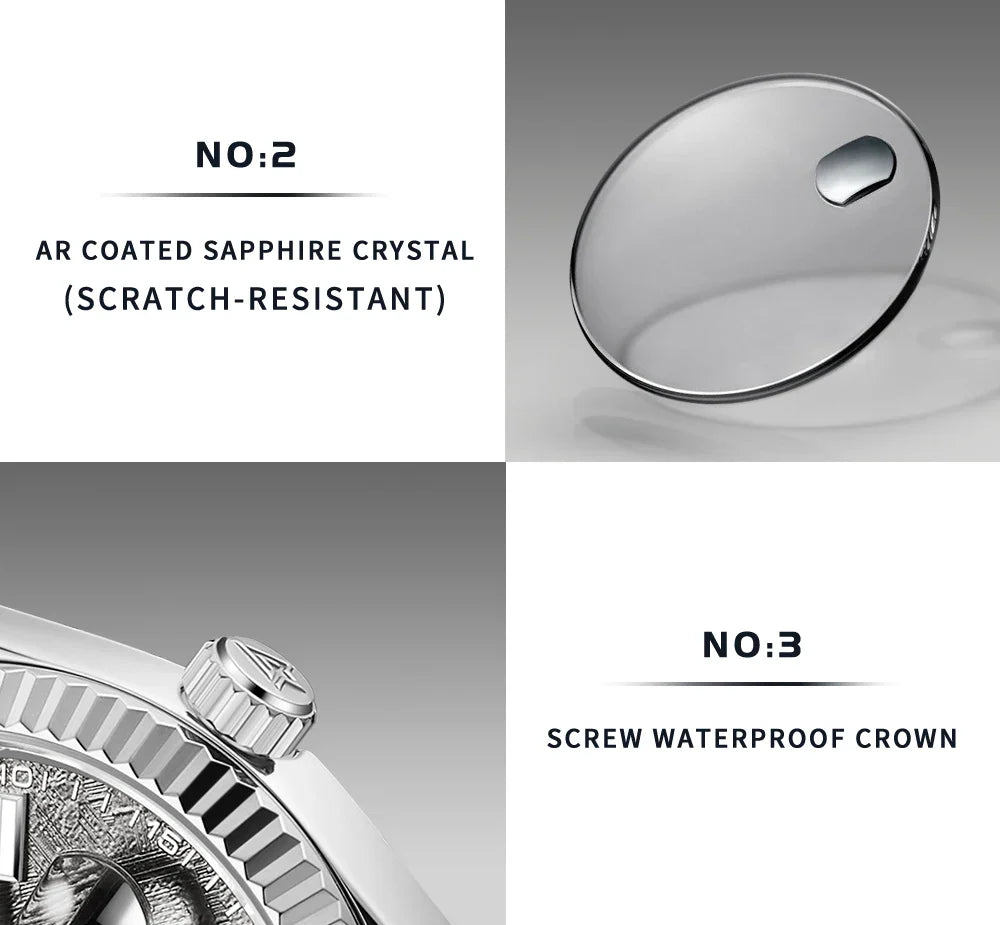 ·The MIYOTA 8215 automatic movement has 42 hours of power reserve and is highly accurate. The rotor is connected to the manual winding mechanism, and it rotates every time the wrist moves, transferring energy to the mainspring. If you wear it for less than 10 hours a day, you can manually wind it to keep it powered. When using the watch for the first time, wind the crown about 20 revolutions.