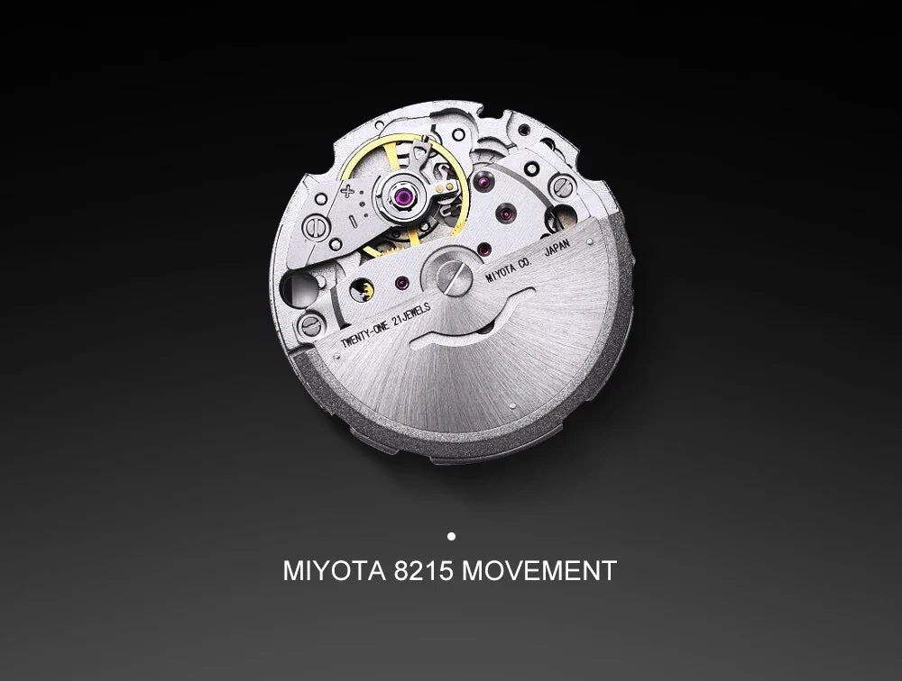 Powered by the reliable MIYOTA 8215 movement, ensuring precision timekeeping without manual winding. -
