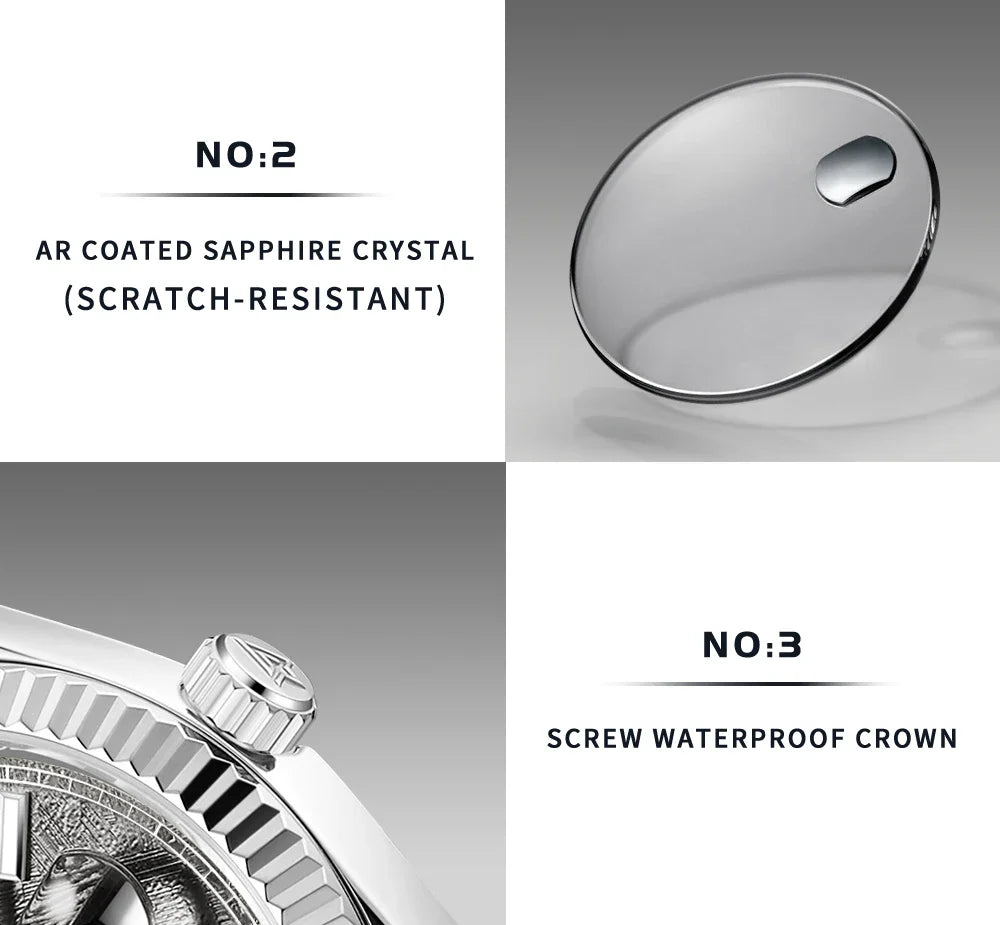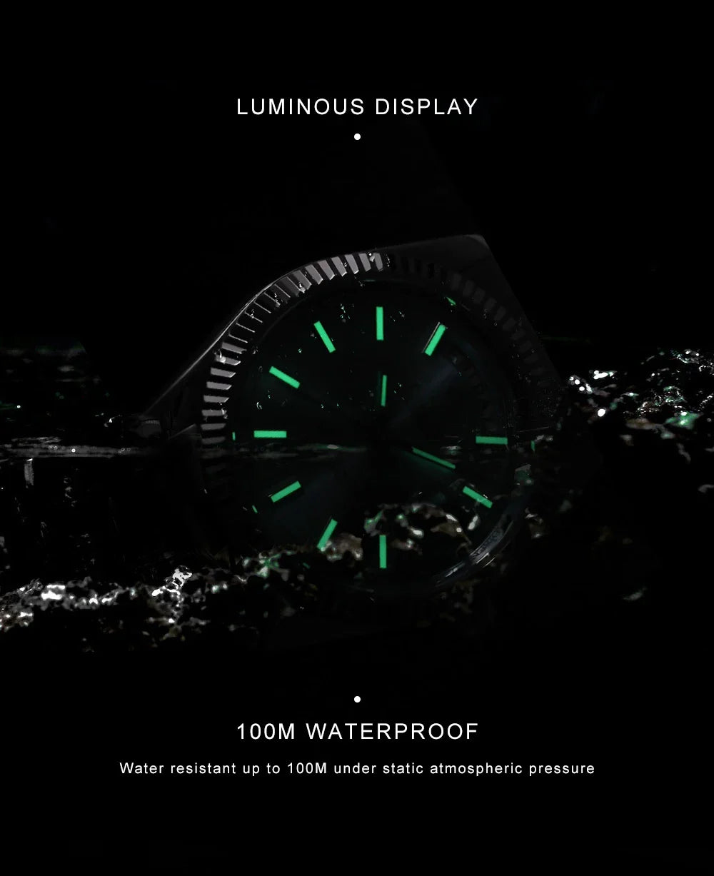·The MIYOTA 8285 automatic movement has 42 hours of power reserve and is highly accurate. The rotor is connected to the manual winding mechanism, and it rotates every time the wrist moves, transferring energy to the mainspring. If you wear it for less than 10 hours a day, you can manually wind it to keep it powered. When using the watch for the first time, wind the crown about 20 revolutions.