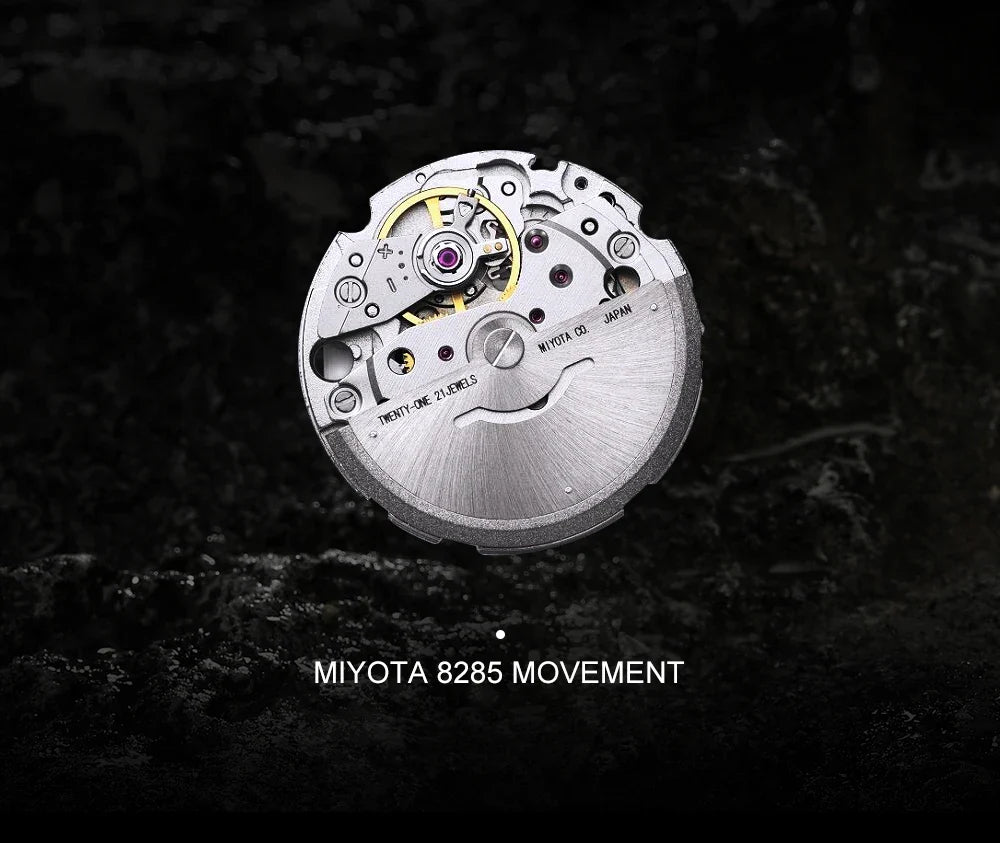Powered by the MIYOTA 8285 automatic self-winding movement, delivering consistent performance for everyday wear. -