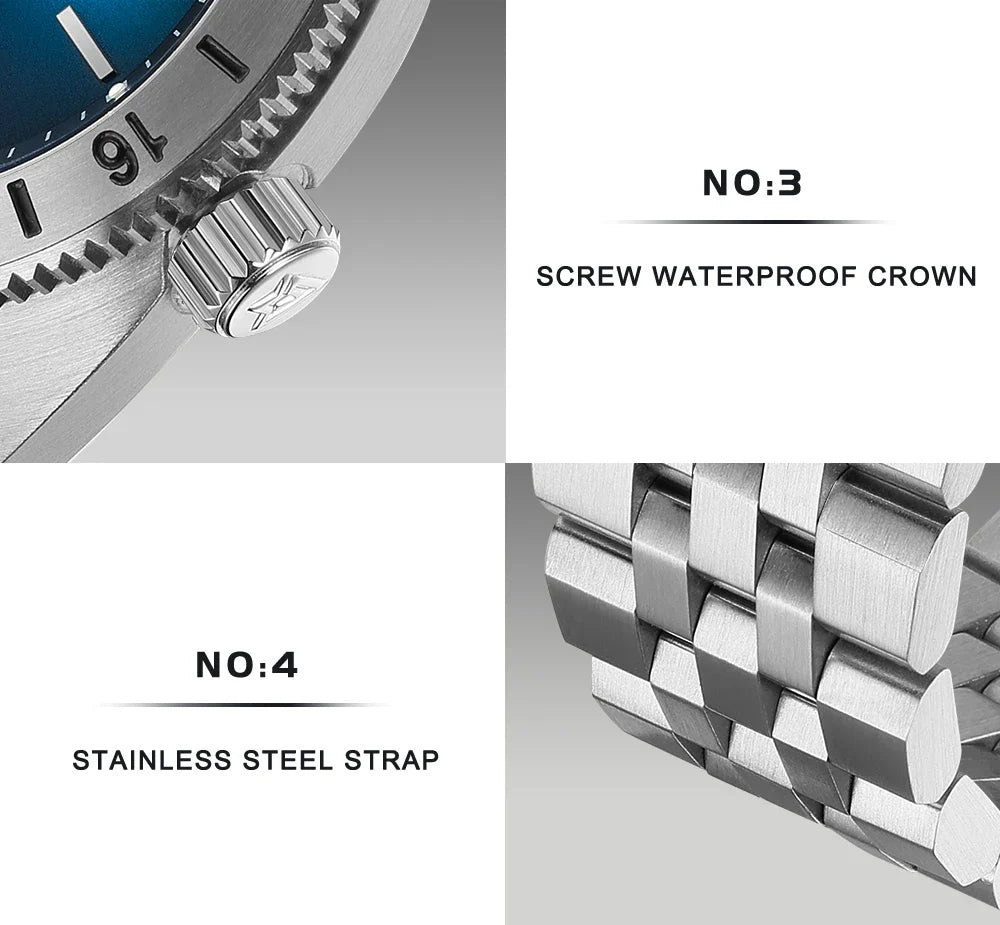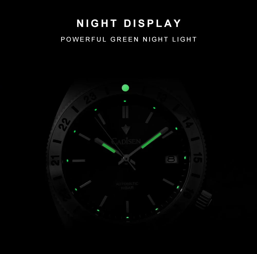 The CADISEN C8230 Dive Watch is a high-quality timepiece designed for diving and water sports. It features a reliable NH35 movement, luminous hands and markers for easy reading in low light conditions. The stainless steel case is coated with AR for increased scratch resistance and the sapphire crystal provides a clear view of the 39mm dial. With a water resistance of 10Bar, this watch is suitable for any underwater adventure.