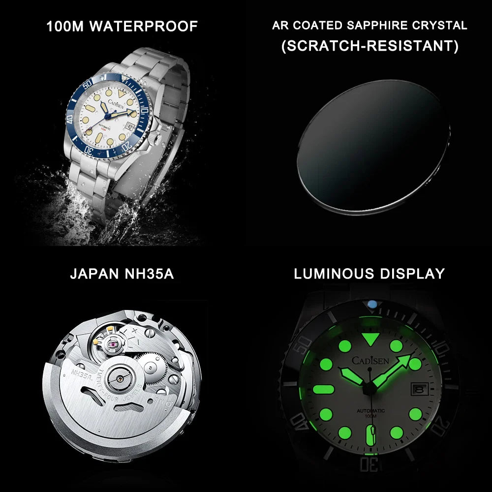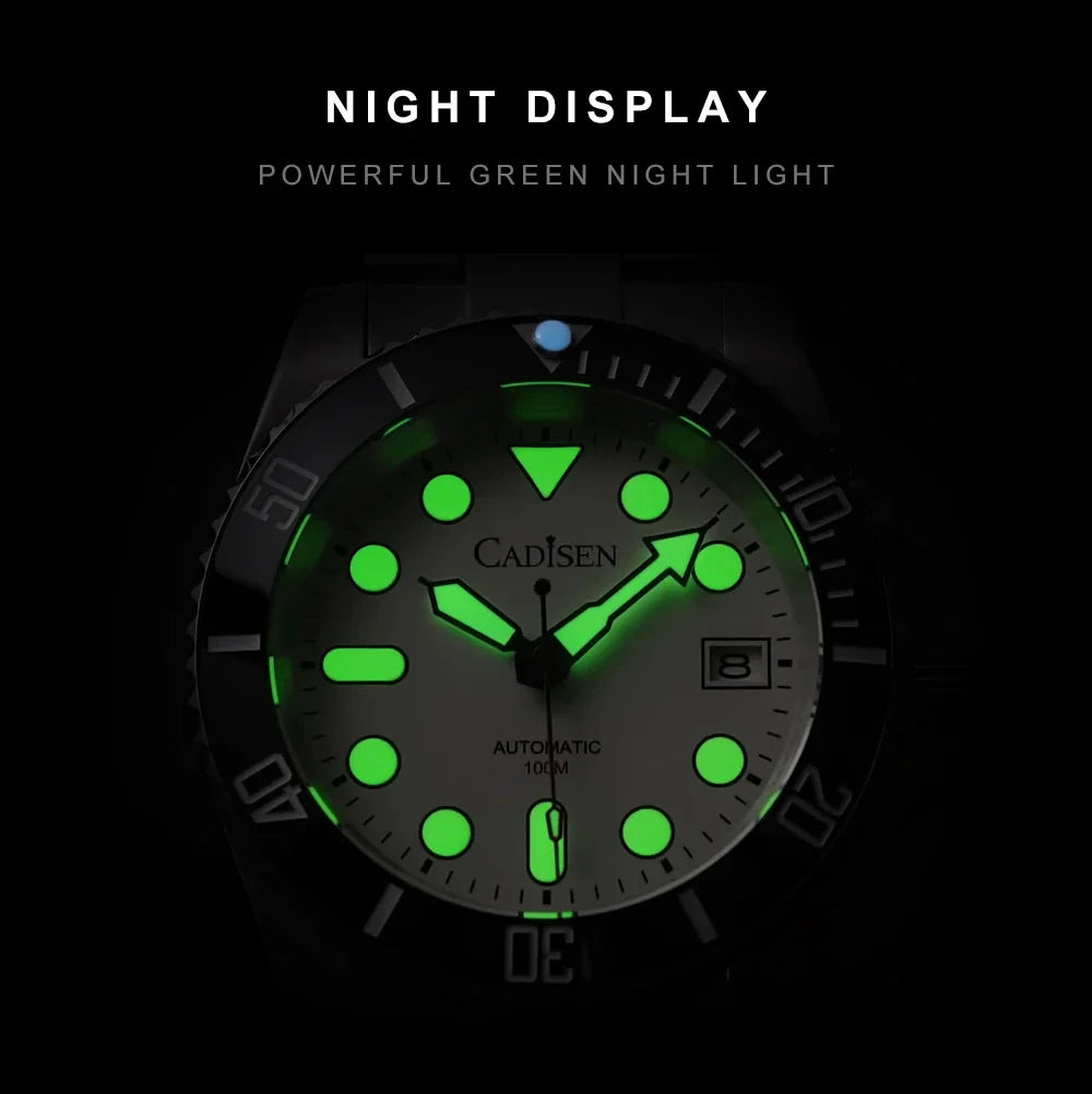 Experience unbeatable precision and style with the CADISEN C8238 Automatic Mechanical Men Wristwatch. Featuring the Seiko NH35 automatic movement, enjoy accurate and self-winding timekeeping without needing frequent manual adjustments. With a 10ATM water resistance and luminous hands and markers, this watch is perfect for swimming and diving. Crafted from durable 316L stainless steel and sapphire crystal with AR coating, its complete calendar function and 40mm case diameter make it a convenient and stylish choice for everyday wear.