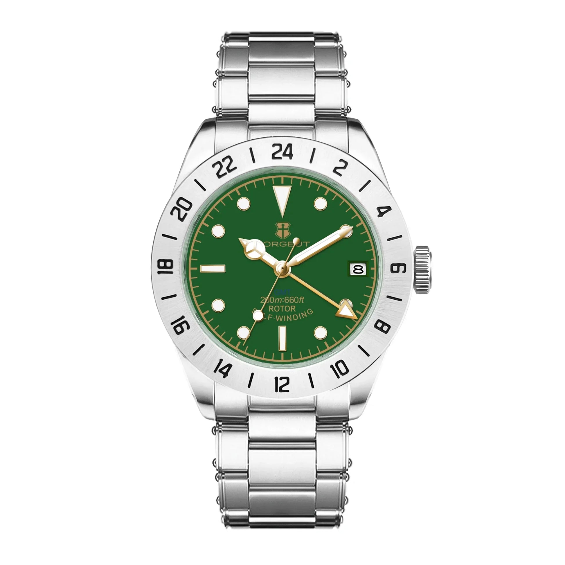 The Corgeut NH34A GMT is a versatile and stylish timepiece designed for travelers and watch enthusiasts. Crafted from durable 316L stainless steel, it features a luminous dial, GMT functionality for dual-time tracking, and a robust water resistance of up to 200 meters. A flat sapphire crystal ensures scratch resistance, while the stainless steel bracelet with a folding clasp provides a secure fit. With its sleek 39mm case and dependable NH34A automatic movement, this watch is perfect for everyday wear and special occasions. Custom logo engraving is available for a personalized touch.