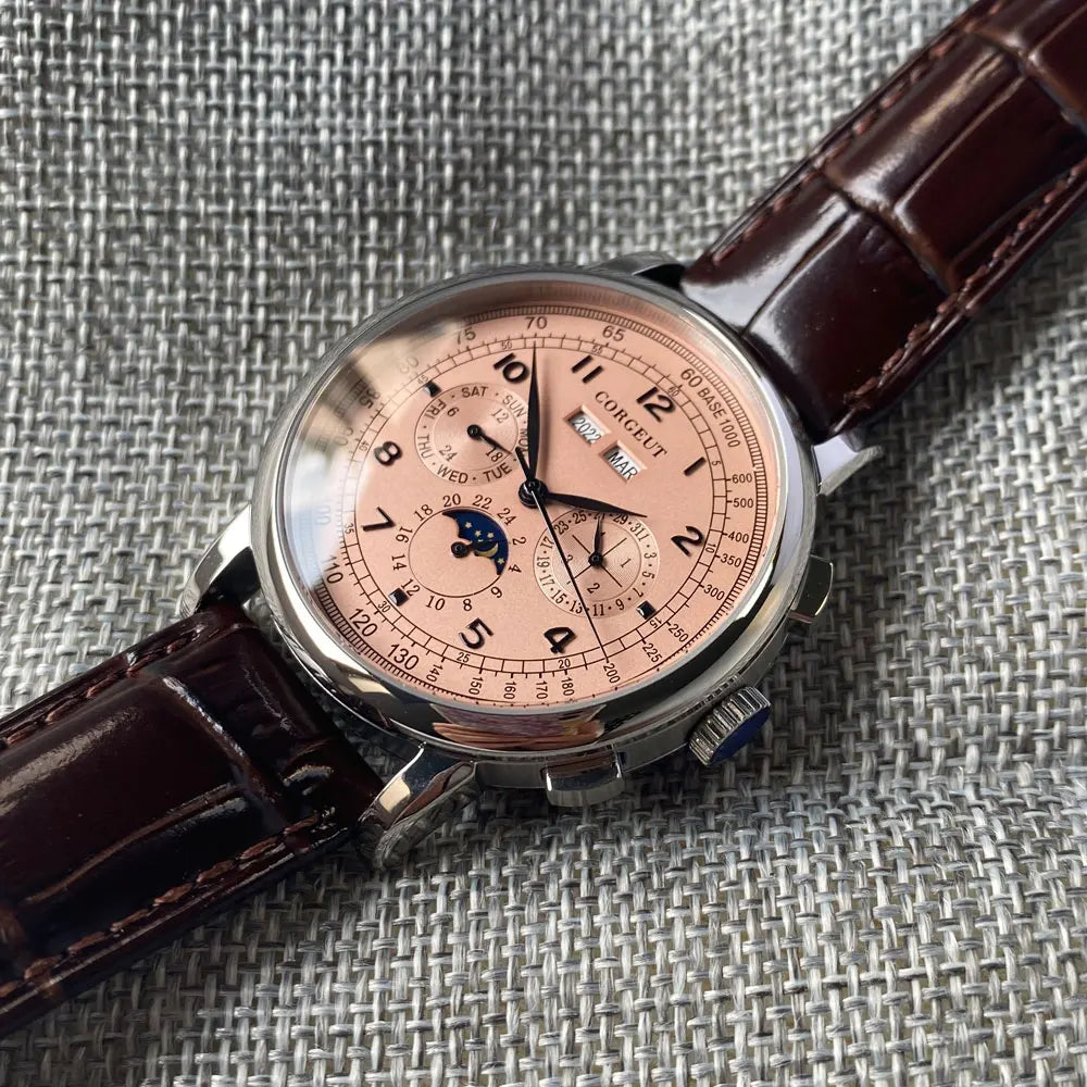 Corgeut Moon Phase Watch 42mm Seagull St1655 Automatic Day Date Month Calendar Glass Back 42MM 3ATM
