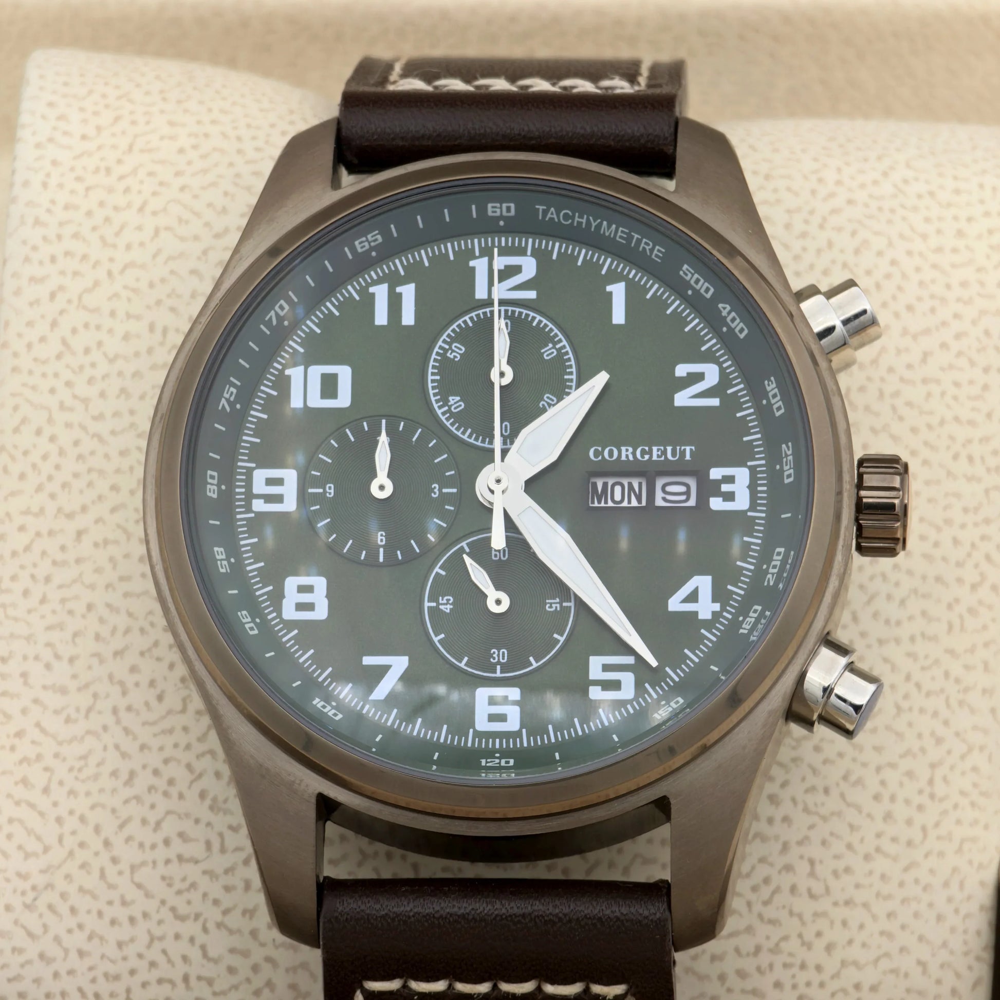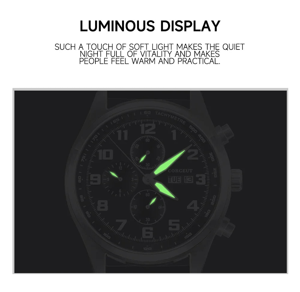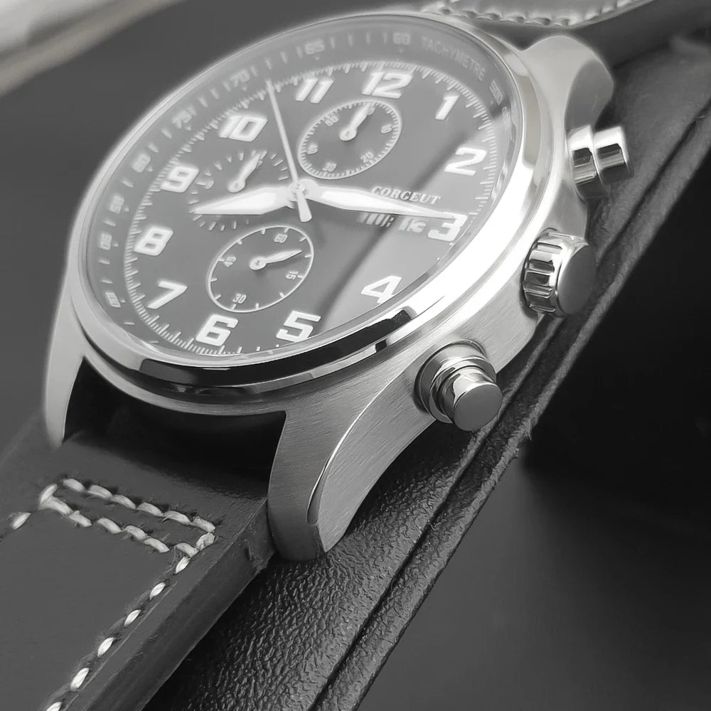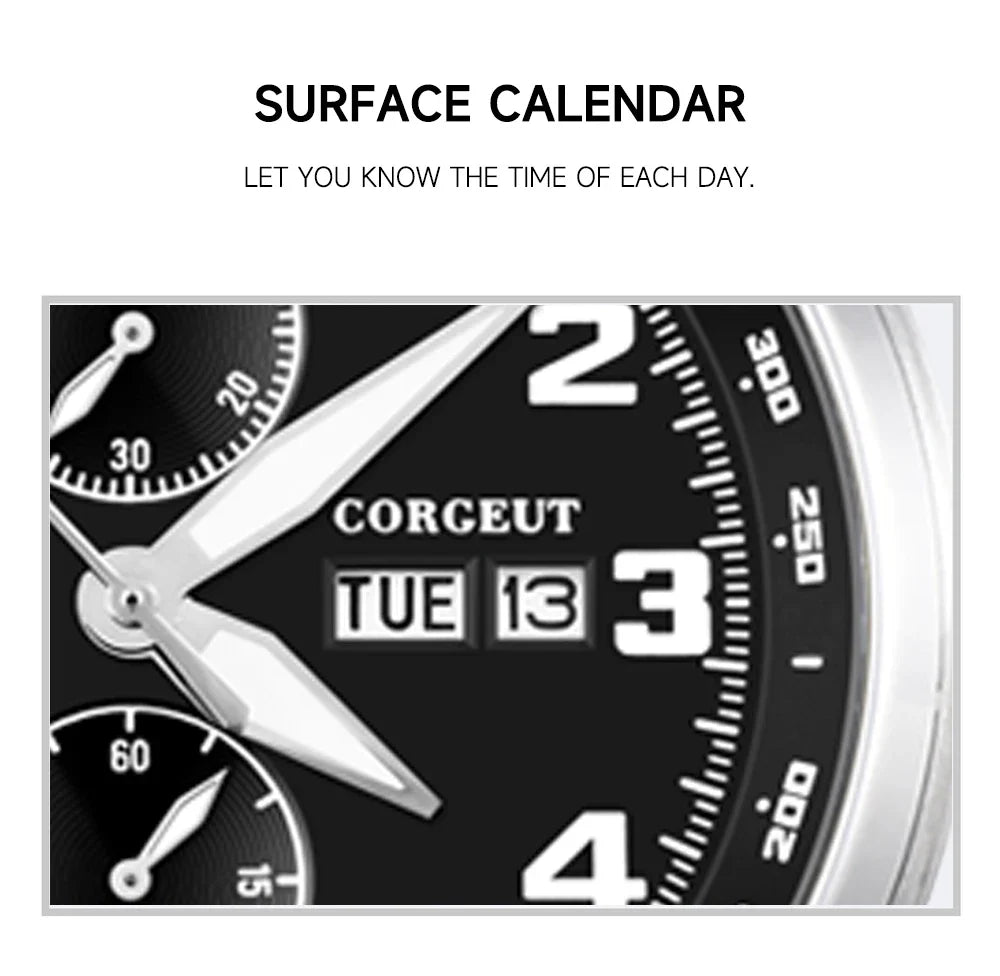 Discover the Corgeut 9003 Quartz Wristwatch, a versatile and stylish timepiece designed for men. This watch features the MIYOTA OS00 quartz movement, ensuring precise timekeeping with a 6-pin design that includes a date and weekly calendar. The 41mm stainless steel case, with a thickness of 13.3mm, is crafted from high-quality 316L fine steel. The dial, measuring 40-44mm in diameter, features Arabic numeral markers and luminous hands for enhanced visibility in low light. The synthetic sapphire crystal mirror provides superior clarity and scratch resistance. With a 3Bar (30m) waterproof rating, this watch is suitable for daily use and light water activities.