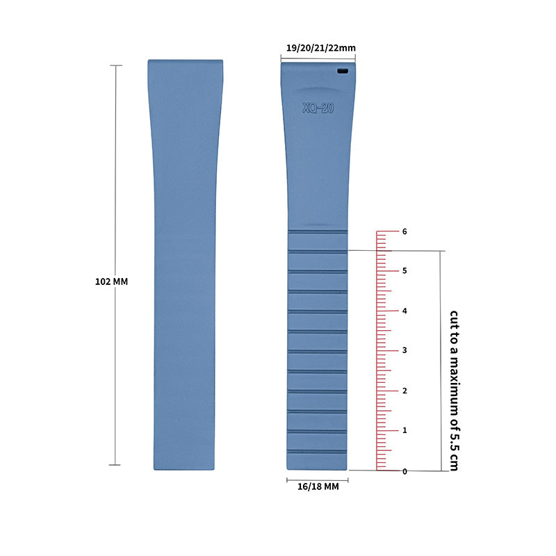 Please note that the rubber will need to be cut in order to size the strap and that the width is tapered meaning that the buckle is 4mm narrower than the lug width. We recommend cutting a section at a time so as not to cut too much off the strap.
