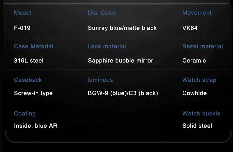 The fifty fathoms mod Hruodland F-019 is a stylish and reliable quartz pilot watch, featuring a VK64 chronograph movement, sapphire crystal, and a handcrafted leather strap for a perfect blend of elegance and performance. With 10ATM water resistance, it’s built for both casual wear and adventure.