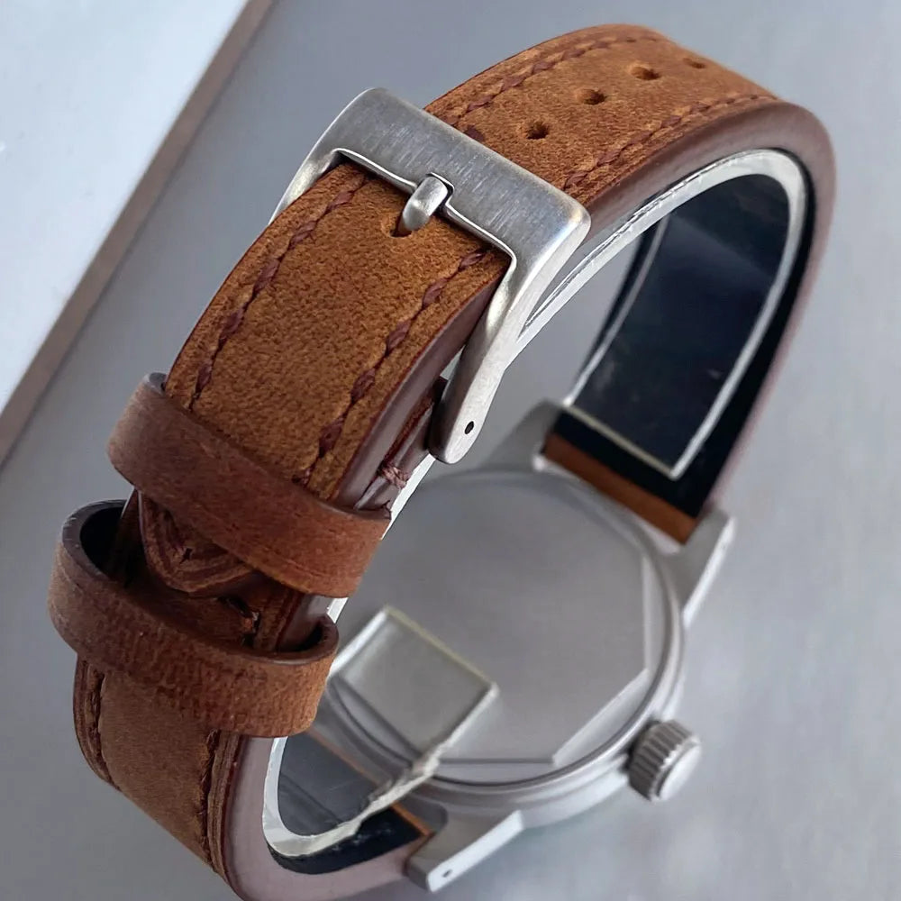 The WristFull P501 combines tactical aesthetics with reliable mechanical performance. Its sandblasted finish resists glare and fingerprints, while the domed sapphire crystal provides scratch resistance and vintage character. Full luminous coating ensures visibility in low-light conditions. Powered by the proven Japanese NH35A automatic movement, this watch delivers consistent timekeeping with manual winding capability. The 100-meter water resistance rating handles daily water exposure and shallow swimming. Built for those who demand functional design without compromise.