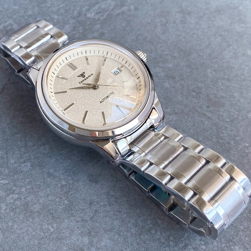 Introducing the Tandorio NH35A Wristwatch with Double Dome Sapphire Glass and a polished finish. Sleek and stylish at 40MM with 20bar water resistance, this dress watch is perfect for any occasion. It also features a transparent glass back, showcasing the high-quality inner mechanics.