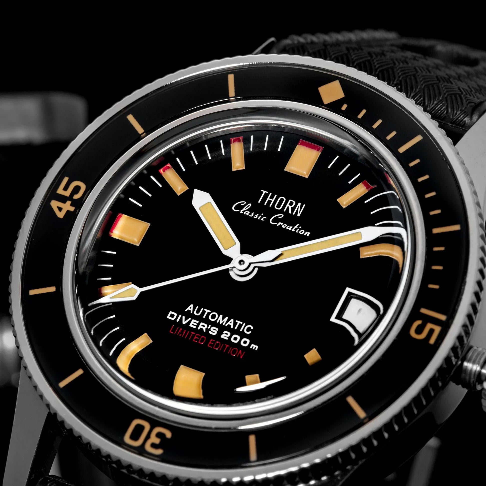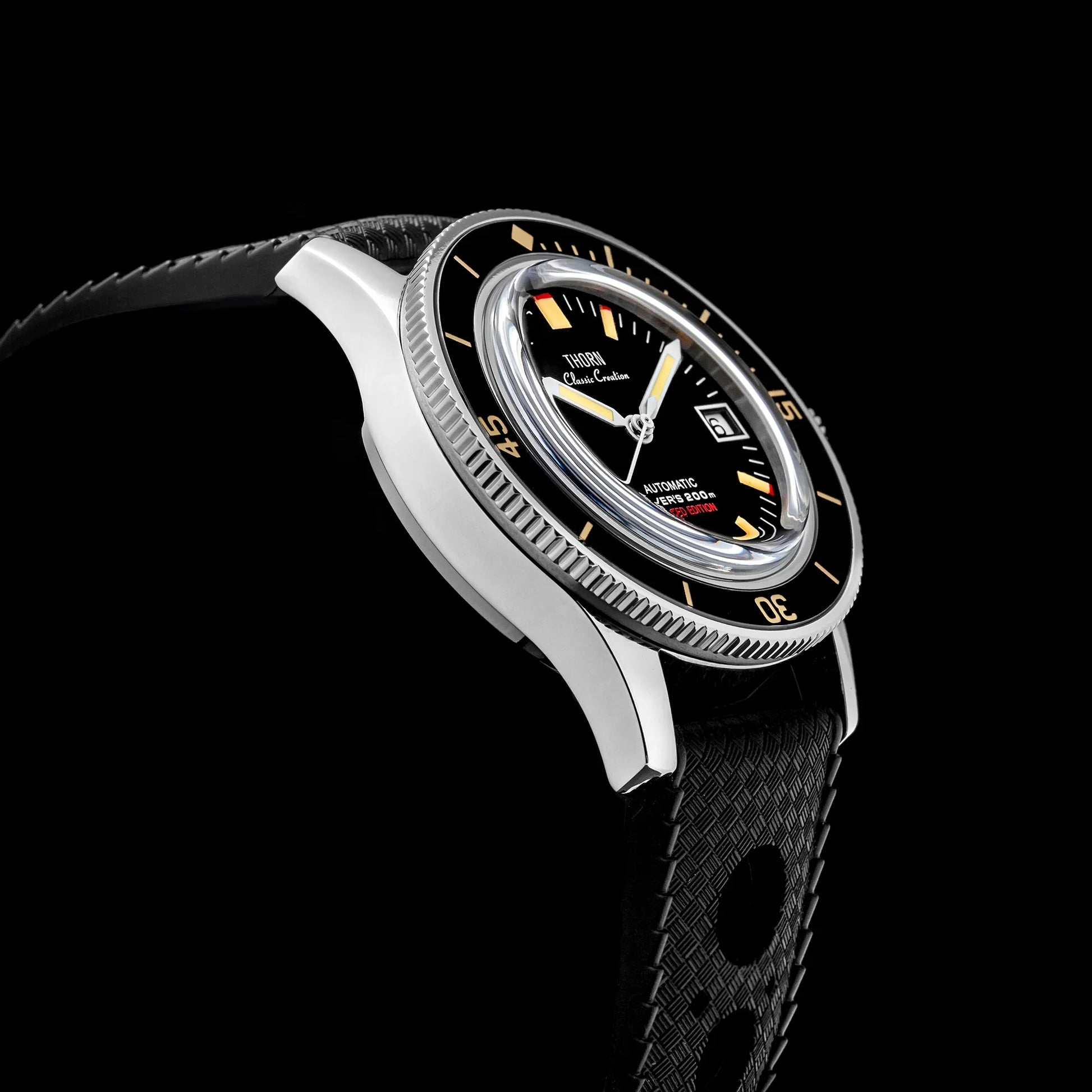 The Titanium Pt5000 Movt 50 fathoms watch THORN T006 is a sleek, vintage-inspired diver's watch designed for those who appreciate lightweight durability and precision engineering. Featuring a titanium case, the watch is both incredibly strong and ultra-lightweight, making it ideal for daily wear and underwater adventures. Powered by the PT5000 hand-wound movement, it offers smooth mechanical precision.